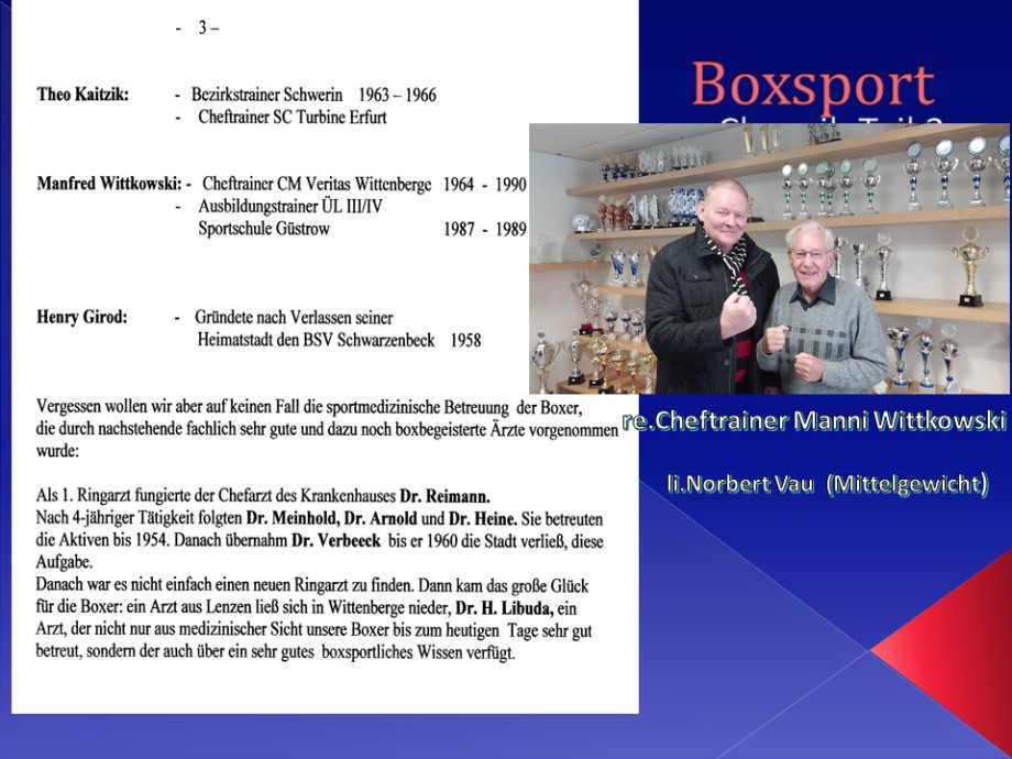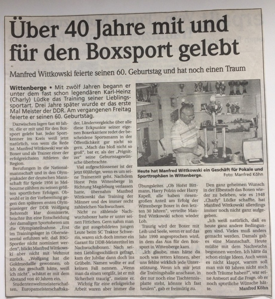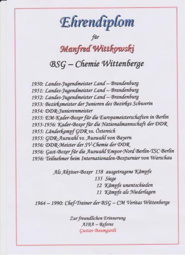 Der Beste Boxer und Trainer Manfred Wittkowski aus Wittenberge hat viele Boxer zum Erfolg geführt, welch eine große Leistung für den Boxsport!!! nun ist er 2016 - 80 Jahre geworden! Danke ------Danke!!!